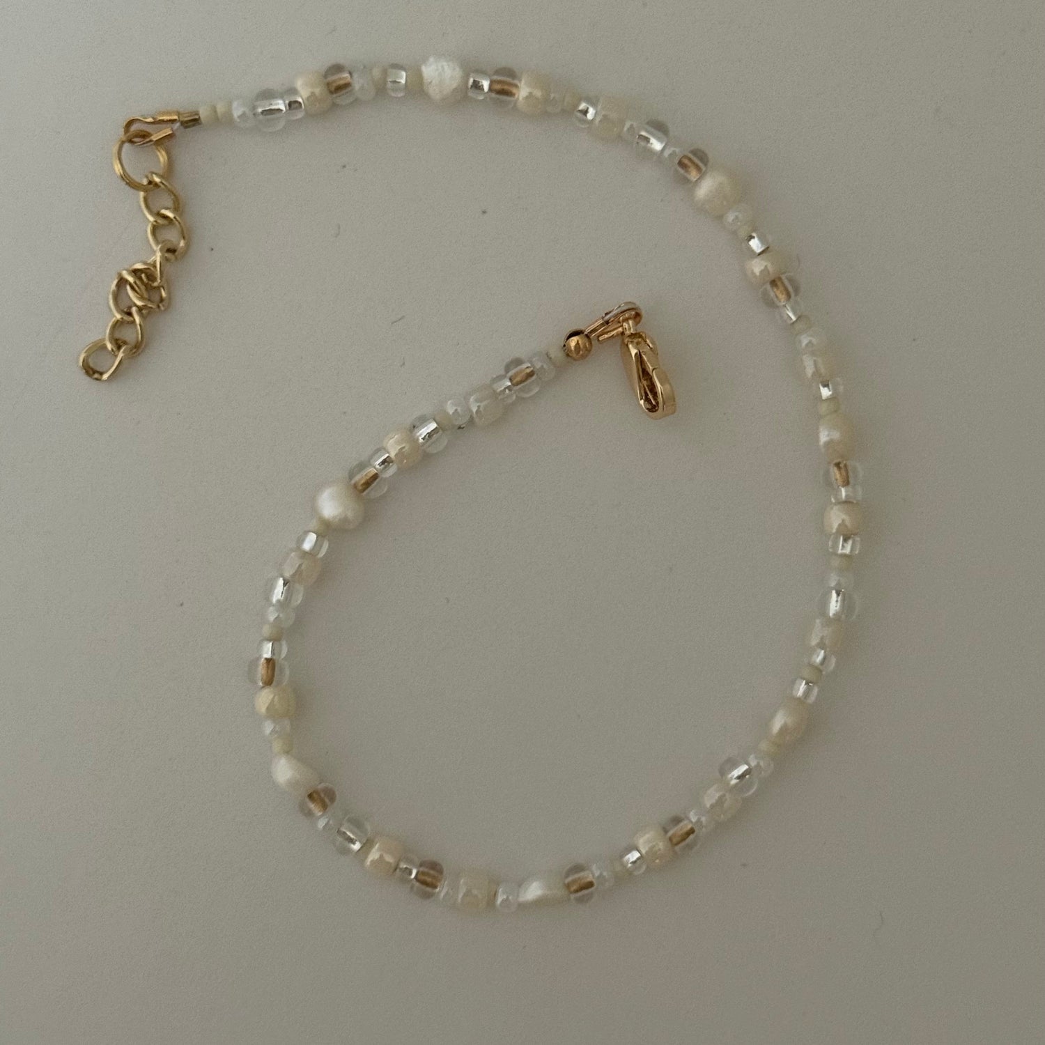 Radiating warmth and whimsy, the Golden Hour Anklet blends the natural beauty of freshwater pearls with the luminous charm of gold-laced glass beads. Each piece is thoughtfully handmade, combining organic textures with a subtle shimmer that catches the light with every step. Designed to evoke the magic of sunset walks and sandy toes, this anklet brings a touch of golden glow to everyday styling.