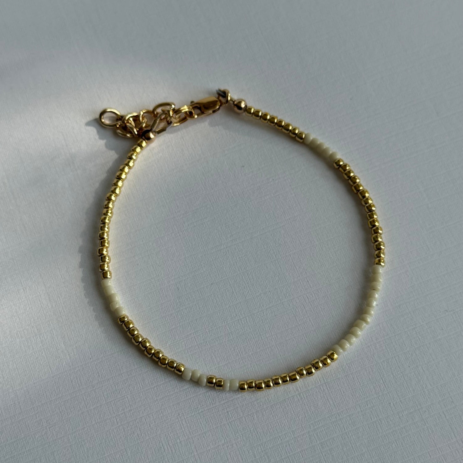 Gold and cream beads, nothing more. Strung by hand, clasped in gold-fill. Minimal, chic, a little nonchalant — the bracelet you slip on without thinking, and somehow never take off.